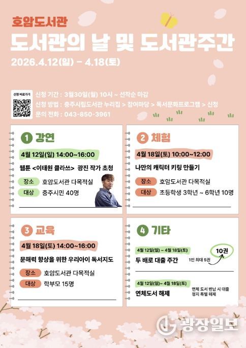 광장일보 이현나 기자 | 충주시 호암도서관은 제4회 ‘도서관의 날’과 제62회 ‘도서관주간’을 맞아 4월 12일부터 18일까지 7일간 다채로운 독서문화 행사를 운영한다고 2일 밝혔다.