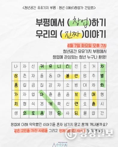 광장일보 주재영 기자 | 부평구 청년공간 유유기지 부평은 오는 7일 ‘청년(예비)창업가 간담회’를 개최한다.