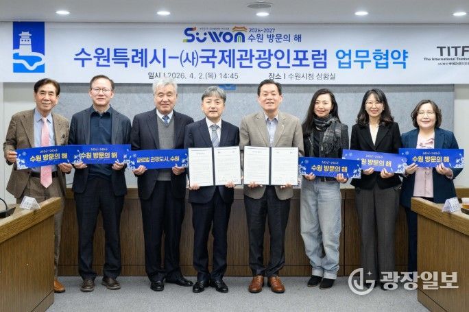 수원시와 (사)국제관광인포럼은 2일 시청 상황실에서 업무협약을 체결하고, ‘제5회 세계관광산업콘퍼런스 개최(6월 5일~6일)’와 ‘2026~2027 수원 방문의 해’의 성공적인 추진을 위해 협력하기로 했다.
