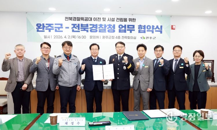 광장일보 주재영 기자 | 완주군과 전북경찰청은 2일 완주군청 전략회의실에서 경찰특공대 이전 및 청사 신축을 위한 업무협약(MOU)을 체결하고 전북 경찰특공대 이전 사업을 본격적으로 추진하기로 했다.