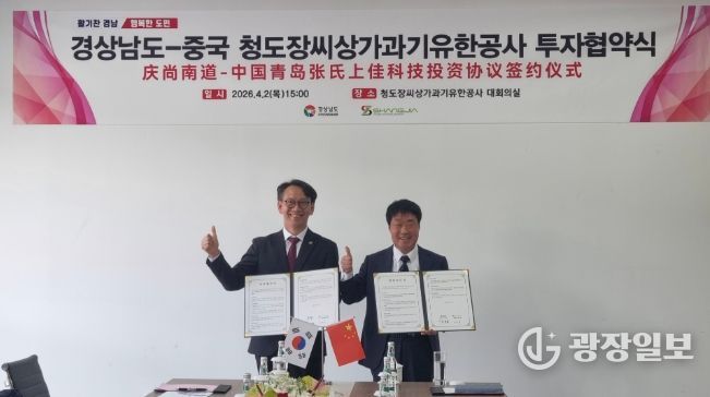 경남도는 2일 중국 산둥성 칭다오시에 위치한 청도장씨상가과기유한공사(이하 장씨상가) 본사에서 경남 도내 자동차 부품 제조시설 투자를 위한 양해각서(MOU)를 체결했다고 밝혔다.