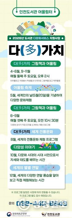 광장일보 주재영 기자 | 인천광역시 인천도서관은 어린이를 대상으로 다양한 문화를 이해하고 존중하는 태도를 기를 수 있도록 2026년 도서관 다문화서비스 지원사업 '다(多)가치'를 운영한다고 밝혔다.