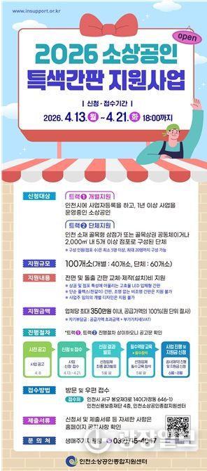 신청을 희망하는 개인 또는 단체는 2026년 4월 13일부터 4월 21일 오후 6시까지 우편 또는 방문 신청할 수 있으며, 자세한 사항은 인천소상공인종합지원포털 또는 인천소상공인종합지원센터 누리집에서 확인할 수 있다.