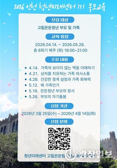 강의는 ‘우리 가족의 보이지 않는 역동 이해하기’ ‘상처를 치유하는 가족 의사소통’ ‘건강한 경계 설정과 가족 회복력’ ‘왜 가족인가’ ‘은둔청년 부모의 정서’ ‘부모의 자기돌봄’ 등을 주제로 한다.