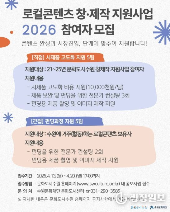 광장일보 박균현 기자 | 수원문화재단은 오는 20일까지 지역 고유의 문화자원을 활용한 로컬콘텐츠 발굴과 창작자 육성을 위해 ‘2026 로컬콘텐츠 창·제작 지원사업’을 함께할 참여자를 모집한다.