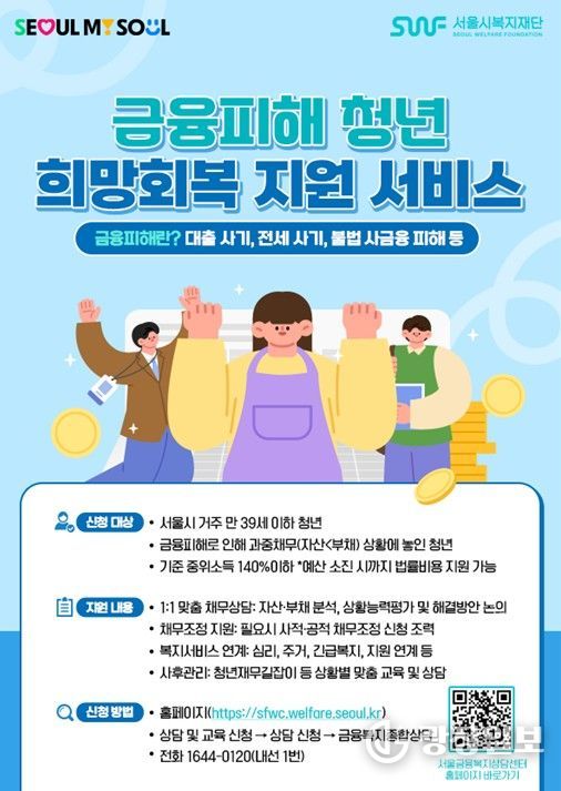 광장일보 주리아 기자 | 서울시복지재단 서울금융복지상담센터는 금융피해를 입은 39세 이하 서울 거주 금융피해 청년을 대상으로 무료 종합채무상담, 채무조정 신청 지원, 복지서비스 연계를 통합적으로 제공하는 '금융피해 청년을 위한 희망회복 지원서비스'를 운영한다고 밝혔다.