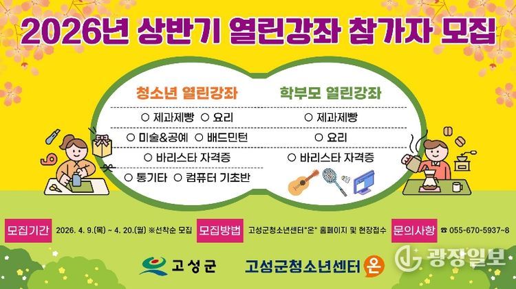 광장일보 주재영 기자 | 고성군청소년센터“온”은 지역 청소년과 학부모를 대상으로 ‘2026년 상반기 열린강좌’ 참가자를 모집하고 있다고 밝혔다.