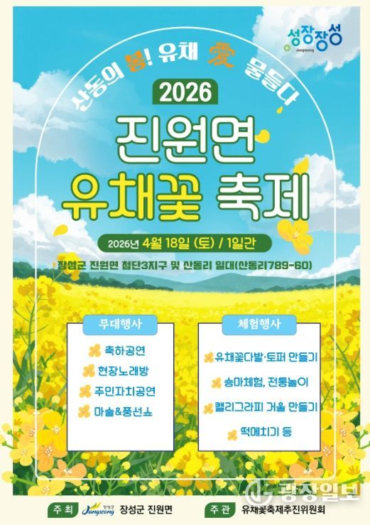 광장일보 주재영 기자 | 장성군 진원면 유채꽃 축제가 오는 18일 산동리에서 열린다.