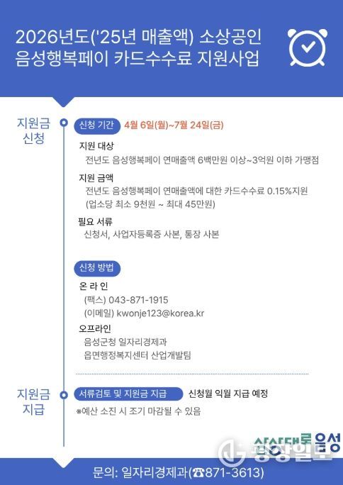 지원 금액은 전년도 음성행복페이 연매출액에 대한 카드수수료 0.15%에 해당하는 금액으로 1개 업체당 최대 45만원까지 지원된다.