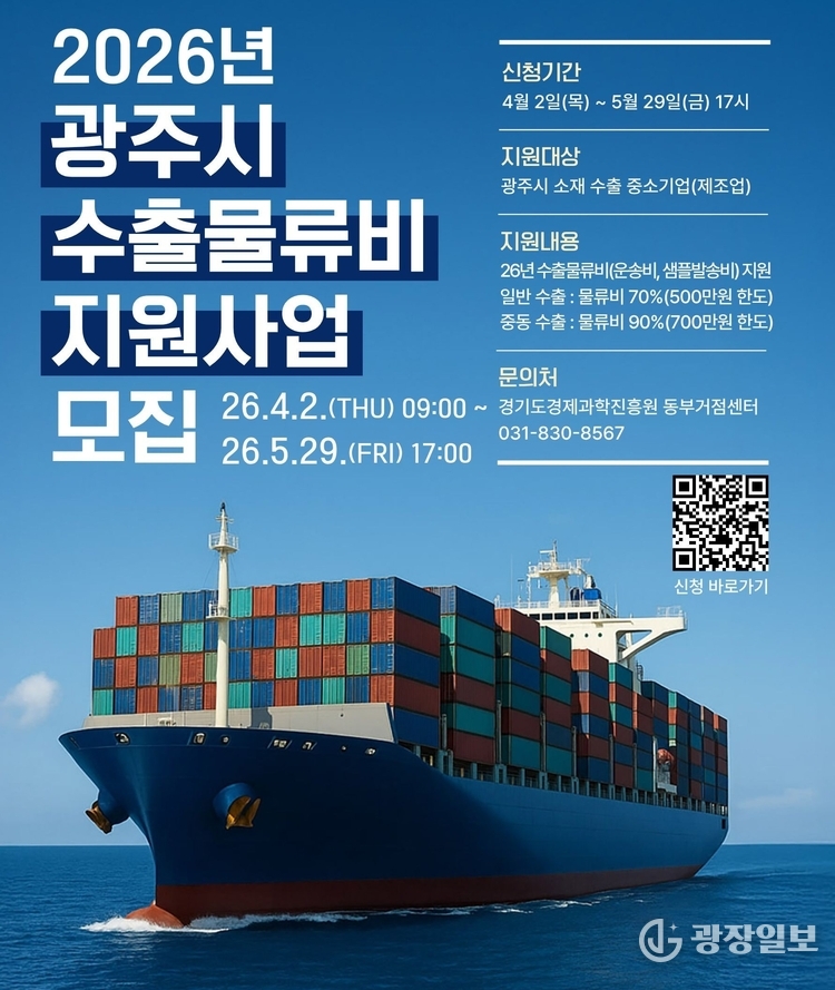 광장일보 =주재영 기자 | 경기도경제과학진흥원과 광주시는 지역 중소 제조기업의 해외시장 진출을 지원하기 위한 '광주시 수출물류비 지원사업' 참가 기업을 4월 2일부터 5월 29일까지 모집한다고 밝혔다.