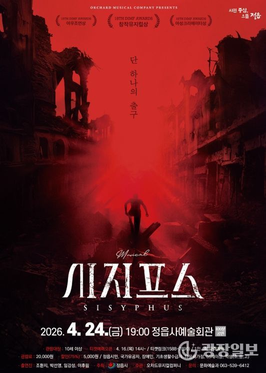 광장일보 주재영 기자 | 정읍시가 시민들에게 수준 높은 문화 향유 기회를 제공하기 위해, 오는 24일 오후 7시 정읍사예술회관에서 창작 음악극(뮤지컬) ‘시지프스’를 무대에 올린다.