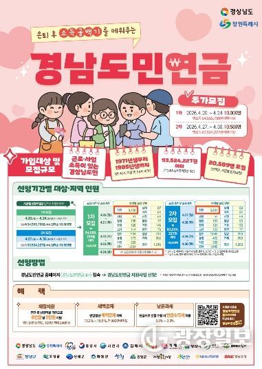 광장일보 주재영 기자 | 창원특례시는 은퇴 후 국민연금 수령 전까지 소득공백기 대비와 노후준비 지원을 위해 지난 1월 ‘경남도민연금’ 가입자 모집에 이어 4월 추가모집을 시행한다고 밝혔다.