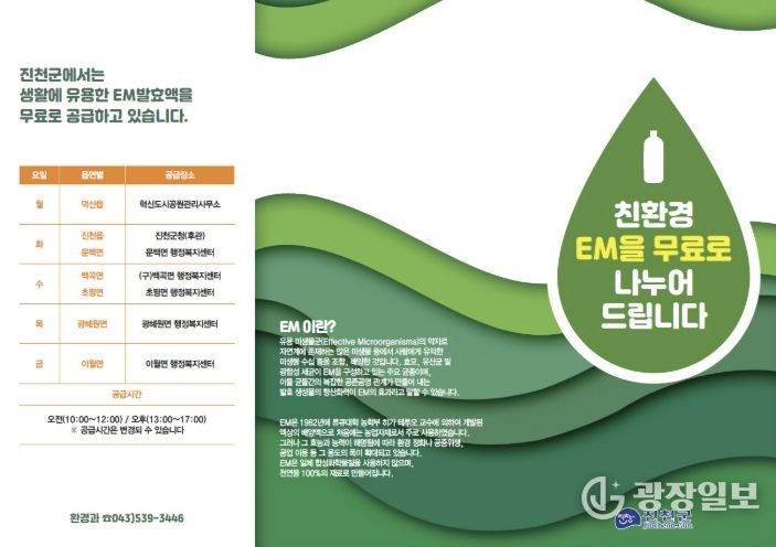 광장일보 이현나 기자 | 충북 진천군은 4월부터 악취 제거와 수질 정화에 효과가 있는 친환경 EM 발효액을 무상으로 보급하고 있다고 13일 밝혔다.
