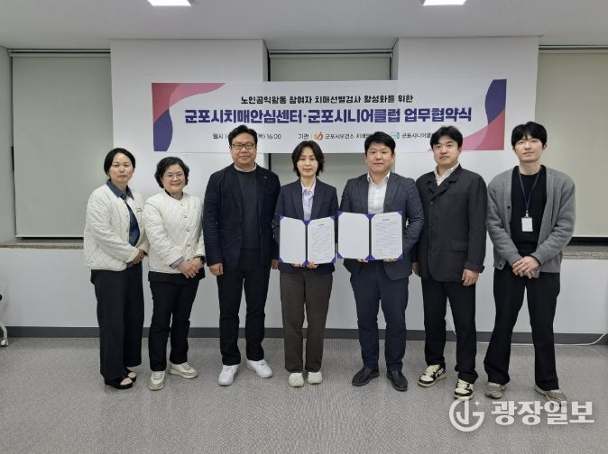 광장일보 주재영 기자 | 군포시치매안심센터는 4월 9일 군포시시니어클럽과 업무협약을 체결하고 노인공익활동 참여자를 대상으로 한 치매선별검사 확대에 나선다고 밝혔다.
