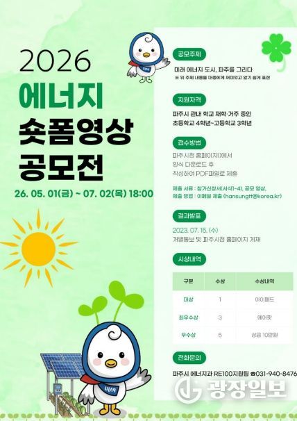 광장일보 주재영 기자 | 파주시는 청소년들의 에너지 인식을 제고하고 디지털 미디어 활용 역량을 강화하기 위해 녪년 파주시 청소년 에너지 숏폼 영상 공모전’을 개최한다.