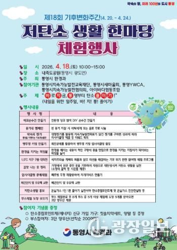 광장일보 주재영 기자 | 통영시는 매년 4월 22일 지구의 날을 맞이해 오는 18일 오전 10시부터 오후 3시까지 통영시 광도면 내죽도 수변공원에서 ‘저탄소 생활 한마당’행사를 개최한다.