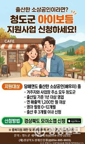 광장일보 주재영 기자 | 청도군은 출산으로 인한 소상공인의 경영 공백을 줄이고 안정적인 영업활동을 지원하기 위해 “2026년 소상공인 아이보듬 지원사업”을 추진한다고 밝혔다.
