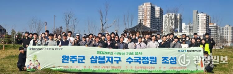 광장일보 주재영 기자 | 완주군 봉동읍에 위치한 한솔케미칼 전주공장과 LH삼봉사회복지관이 제81회 식목일을 맞아 완주군 삼봉지구 감돌숲공원에서 ‘수국 정원 조성 행사’를 열고 지역사회를 위한 환경 가꾸기에 나섰다.