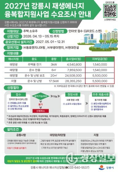 광장일보 이현나 기자 | 강릉시는 기후위기 대응과 에너지 자립도 향상을 목표로 기후에너지환경부 주관 '2027년 재생에너지보급지원(융·복합지원사업)' 공모 신청을 위해 사전 수요조사를 한다.