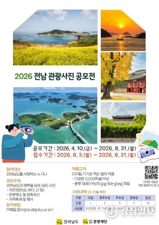 광장일보 주재영 기자 | 전라남도는 자연경관과 관광지, 축제 등 지역의 다양한 매력을 널리 알리고 수준 높은 사진 콘텐츠를 발굴하기 위해 ‘2026년 전남 관광사진 공모전’을 추진한다.