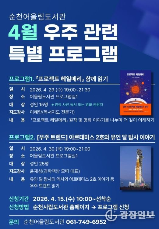 광장일보 주재영 기자 | 순천시는 과학의 달 4월을 맞아 어울림도서관의 우주항공 특성화 주제와 연계한 특별 프로그램을 운영한다고 밝혔다.