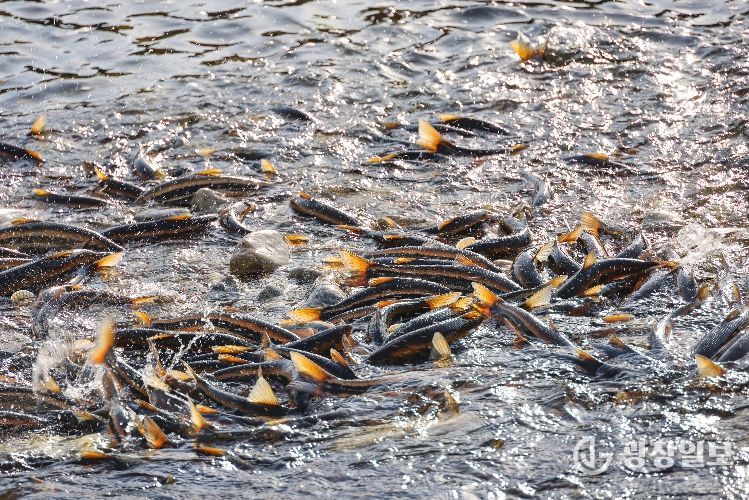 광장일보 이현나 기자 | 양양군의 젖줄인 남대천이 봄의 전령사 ‘황어’ 떼로 가득 찼다. 양양군은 최근 남대천 하구부터 상류 여울까지 산란을 위해 거슬러 올라온 황어들이 새까맣게 무리를 지으며 장관을 이루고 있다고 밝혔다.