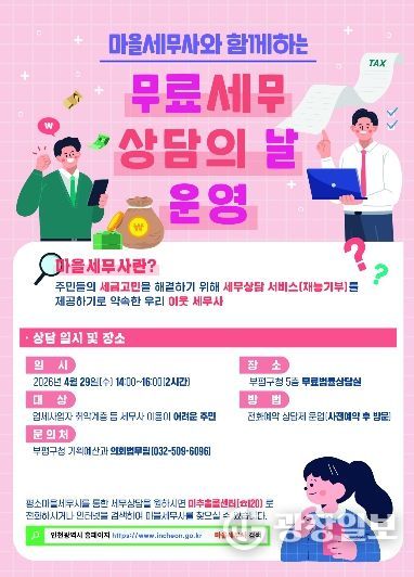 광장일보 주재영 기자 | 부평구는 오는 29일 구청 5층 무료법률상담실에서 마을세무사와 함께하는 ‘무료 세무 상담의 날’을 운영한다.