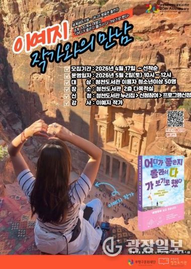 광장일보 주재영 기자 | 부평구 청천도서관은 여행에세이 ‘어디가 좋은지 몰라서 다 가보기로 했다’의 저자 이예지 작가와 함께하는 ‘작가와의 만남’ 프로그램 참가자를 모집한다고 밝혔다.