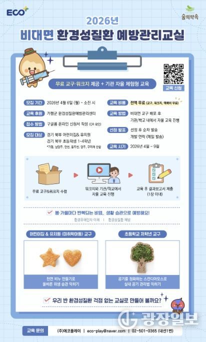 광장일보 주재영 기자 | 가평군 환경성질환예방관리센터 ‘숲의 약속’이 어린이들의 건강한 생활 습관 형성을 돕기 위해 ‘2026년 비대면 환경성질환 예방관리교실’ 참여 기관을 모집한다.