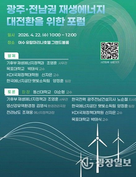 광장일보 주재영 기자 | 기후에너지환경부 영산강유역환경청은 ‘대한민국 녹색대전환(K-GX) 국제주간 행사’를 맞아, 4월 22일 전라남도 여수시 유탑마리나호텔에서 (재)녹색에너지연구원과 함께'광주·전남권 재생에너지 대전환을 위한 포럼'을 개최한다고 밝혔다.