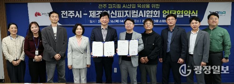시와 제조혁신피지컬AI협회는 16일 시청 3층 소회의실에서 윤동욱 전주시장 권한대행 부시장과 조용로 협회장 등 양 기관 관계자들이 참석한 가운데 ‘피지컬 AI 산업 육성을 위한 업무협약’을 체결했다.