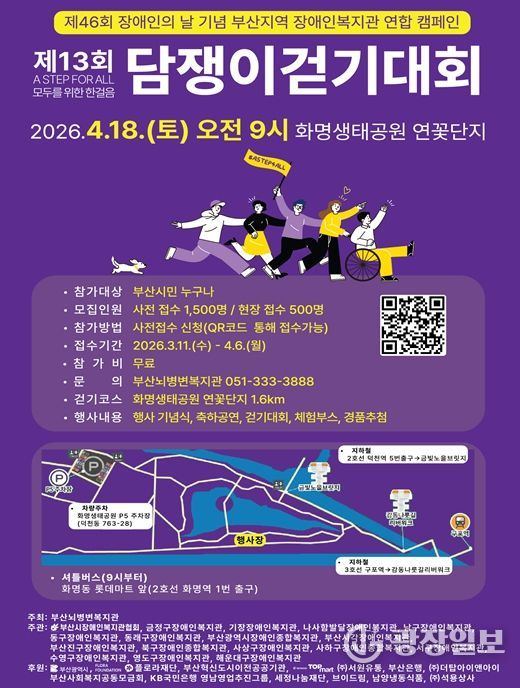 광장일보 주재영 기자 | 부산시는 장애인의 날(4.20.)을 맞이해 내일(18일) 오전 9시 화명생태공원에서 '제13회 담쟁이 걷기대회'가 열린다고 밝혔다.