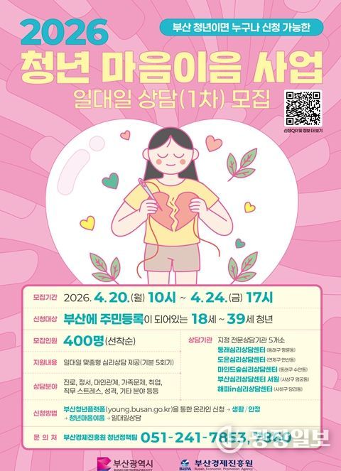 광장일보 주재영 기자 | 부산시는 정서적으로 어려움을 겪는 청년들의 마음 회복을 돕기 위해 '2026년 청년 마음이음 사업' 참여자를 모집한다고 밝혔다.