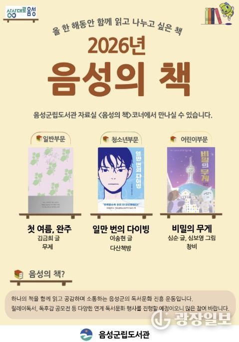 광장일보 이현나 기자 | 음성군은 책으로 소통하는 독서문화를 확산하기 위한 2026년 ‘음성의 책’을 최종 선정했다고 밝혔다.