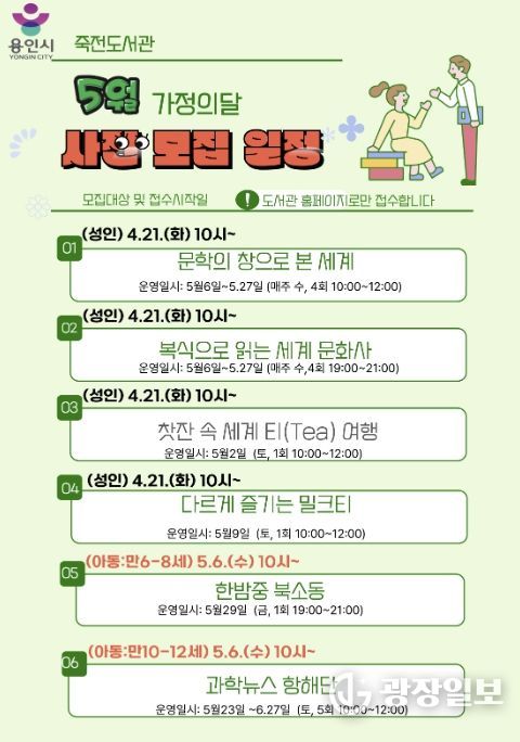 광장일보 주재영 기자 | 용인특례시 죽전도서관은 오는 5월 가정의 달을 맞아 ‘2026년 5월 독서문화행사’를 개최한다.