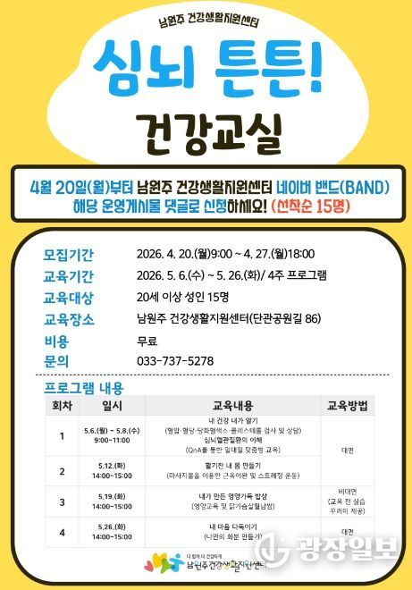 광장일보 이현나 기자 | 남원주건강생활지원센터는 심뇌혈관질환의 이해·예방과 건강관리를 돕기 위해 5월 6일부터 26일까지 ‘심뇌 튼튼! 건강교실’을 운영한다.