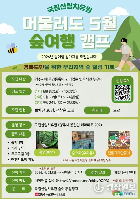 광장일보 주재영 기자 | 산림청 한국산림복지진흥원 국립산림치유원은 자연 속에서 휴식과 치유를 경험할 수 있는'머물러도 숲여행 5월 캠프' 참가자를 모집한다고 17일 밝혔다.