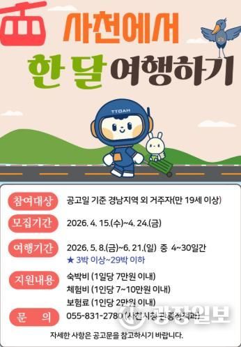 시 관계자는 “이번 프로그램은 단순 방문을 넘어 머무르며 사천의 매력을 깊이 체험할 수 있는 기회”라며 “참가자들의 생생한 콘텐츠를 통해 사천 관광이 더욱 널리 알려지기를 기대한다”고 말했다.
