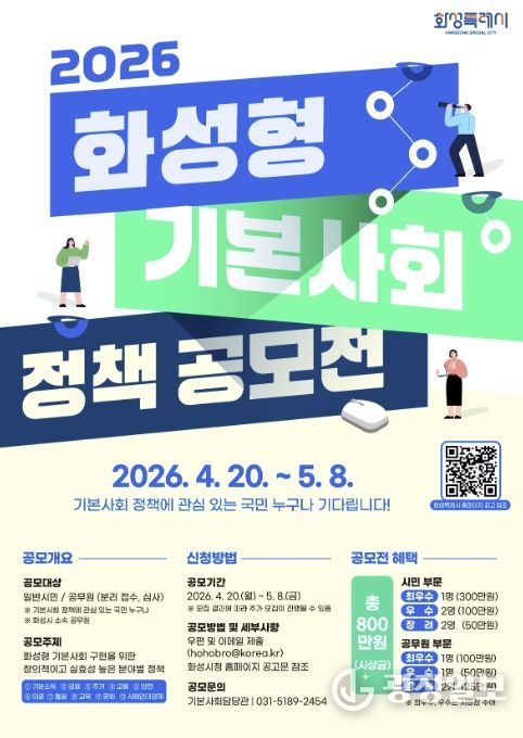 광장일보 나병석 기자 | 화성특례시는 시민 참여 기반을 확대하고, 실효성 있는 기본사회 정책을 발굴하기 위해 '2026년 화성형 기본사회 정책 공모전'을 개최한다고 밝혔다.