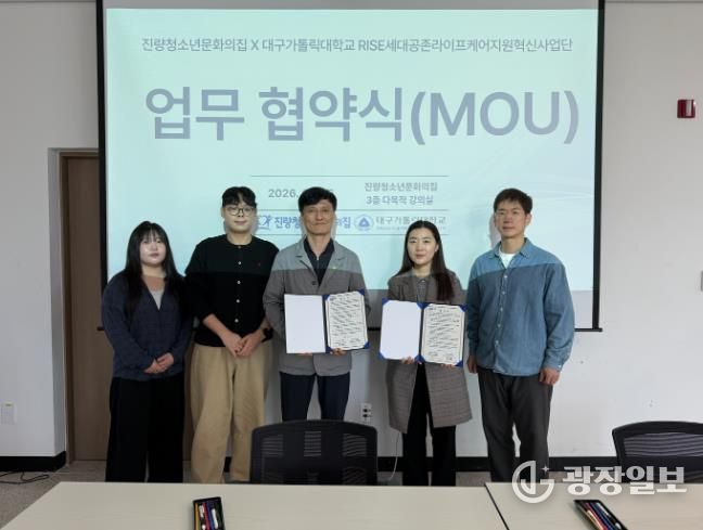 광장일보 주재영 기자 | 진량청소년문화의집은 지역 청소년들에게 심리, 상담, 활동 등 다양한 경험을 지원하기 위하여 16일 대구가톨릭대학교 RISE 세대공존 라이프케어 지원혁신사업단과 업무협약을 체결했다.