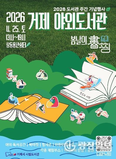 광장일보 주재영 기자 | 거제시 시립도서관은 4월 도서관 주간을 맞아 오는 4월 25일 상동동 용산쉼터에서 시민 참여형 야외 독서문화 행사인 2026 거제 야외도서관 『봄날의 書(서)핑』을 개최한다.
