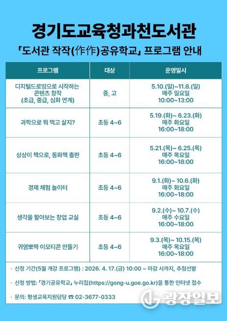 조중복 경기도교육청과천도서관장은 “작작(作作) 공유학교는 독서를 기반으로 학생들이 스스로 생각하고 표현하는 경험을 통해 미래 역량을 키우는 프로그램”이라며 “앞으로도 학교와 지역을 연계한 다양한 교육 프로그램을 통해 학생 중심의 배움 환경을 지속적으로 확대해 나가겠다”고 말했다.