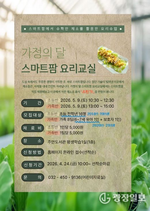 광장일보 주재영 기자 | 인천광역시교육청주안도서관은 5월 가정의 달을 맞아 오는 5월 9일 ‘스마트팜 요리교실’을 운영한다.