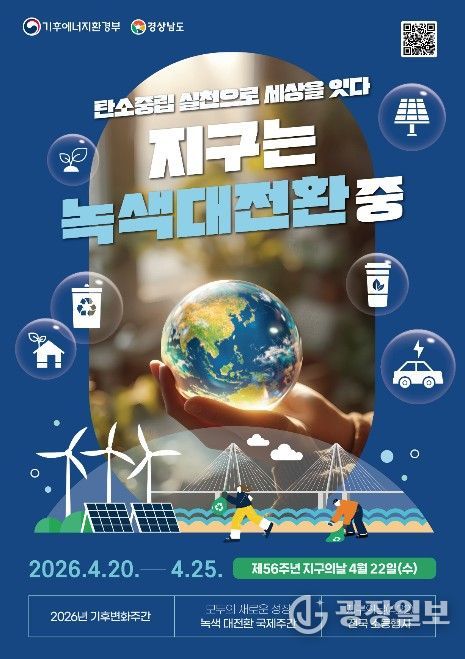광장일보 주재영 기자 | 경상남도는 56주년 ‘지구의 날’을 기념해 탄소중립에 대한 도민 인식을 높이고 생활 속 실천 문화를 확산하기 위해 20일부터 24일까지 5일간 ‘제18회 기후변화주간’을 운영한다고 밝혔다.