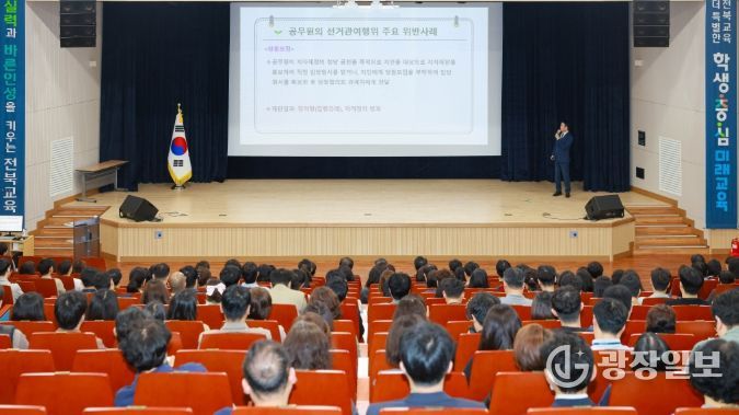 광장일보 주재영 기자 | 전북특별자치도교육청은 6월 3일 치러지는 전국동시지방선거를 앞두고 공무원의 정치적 중립 의무에 대한 이해를 높이고 선거 관련 위법행위를 사전에 예방하기 위해 17일 창조나래 시청각실에서 전 직원 대상 직장교육을 실시했다.