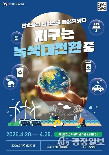 광장일보 주재영 기자 | 목포시는 제56주년 지구의 날(4월 22일)을 맞아 오는 20일부터 25일까지 ‘2026년 기후변화주간’을 운영하고, 탄소중립 인식 제고와 생활 속 실천문화 확산을 위한 다양한 행사를 추진한다고 밝혔다.