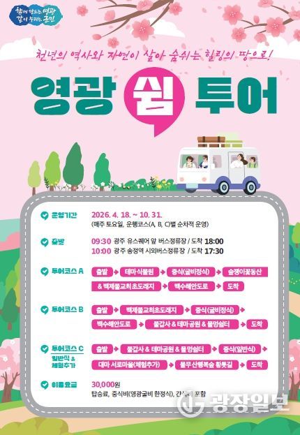 광장일보 주재영 기자 | 영광군은 4월 18일부터 10월 31일까지(7∼8월 폭염으로 제외) 토요 감성 힐링 여행‘2026년 영광 쉼 투어’를 매주 토요일 운영 한다고 밝혔다.