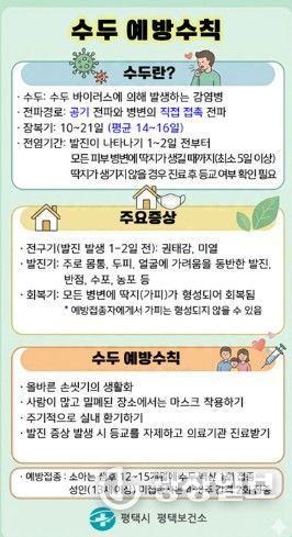 평택보건소 관계자는 “수두는 어린이집, 유치원, 학교 등 집단시설에서 쉽게 전파될 수 있어 가정과 시설의 적극적인 협조가 중요하다”며, “지속적인 감염병 발생 동향 모니터링과 예방 홍보를 통해 시민 건강 보호에 최선을 다하겠다”고 밝혔다.