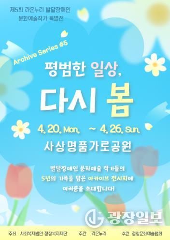 광장일보 주재영 기자 | 부산 사상구는 장애인거주시설 라온누리(엄궁동)가 오는 4월 20일부터 26일까지 사상 명품가로공원 일대에서 제5회 라온누리 발달장애인 문화예술 작가 특별전 ‘평범한 일상, 다시 봄’을 개최한다고 밝혔다.