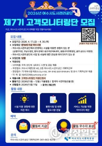 광장일보 주재영 기자 | 여수시도시관리공단은 시민 참여를 기반으로 공단 시설과 서비스 품질을 점검하고 개선하기 위한 '2026년 제7기 고객모니터링단'을 모집한다고 밝혔다.